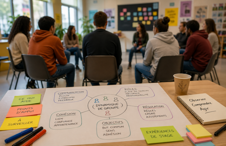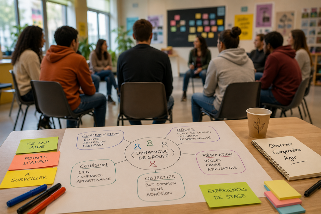Le lien avec les stages devient alors plus direct. Les participant·e·s commencent à identifier, dans leurs propres contextes, des situations similaires : des groupes qui semblent fonctionner mais laissent peu de place à certains, des tensions non exprimées, ou des cadres insuffisamment installés.